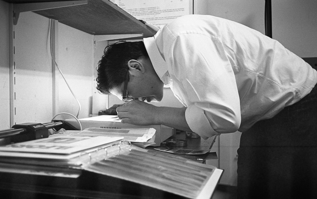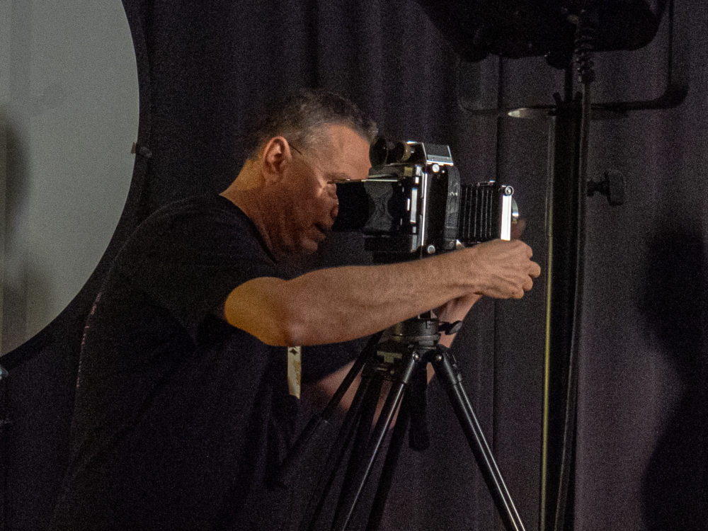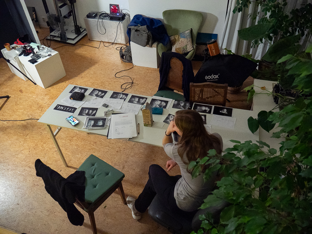Op de foto’s hieronder werkte Ruud Bos op zijn technische camera aan een expositie en boekje over karaktermoord.